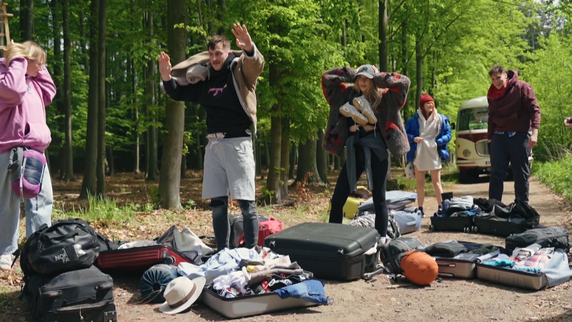 Jako první na místo srazu dorazili „Nováčci“, kteří se s kufry objevili na lesní cestě. Tuto skupinku tvoří převoznice výbušnin Zuzana (59), autotronička a surfařka Sandra (21), zdravotní sestra Kateřina (25), streamer a influencer Luboš Bailador (49), fotbalista Javier (23) a reportér a zpěvák Michal (40).