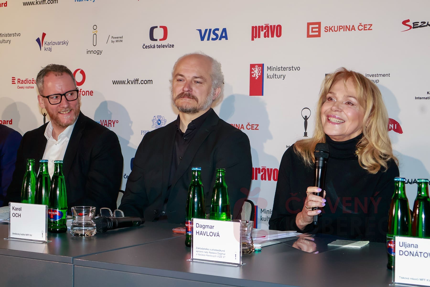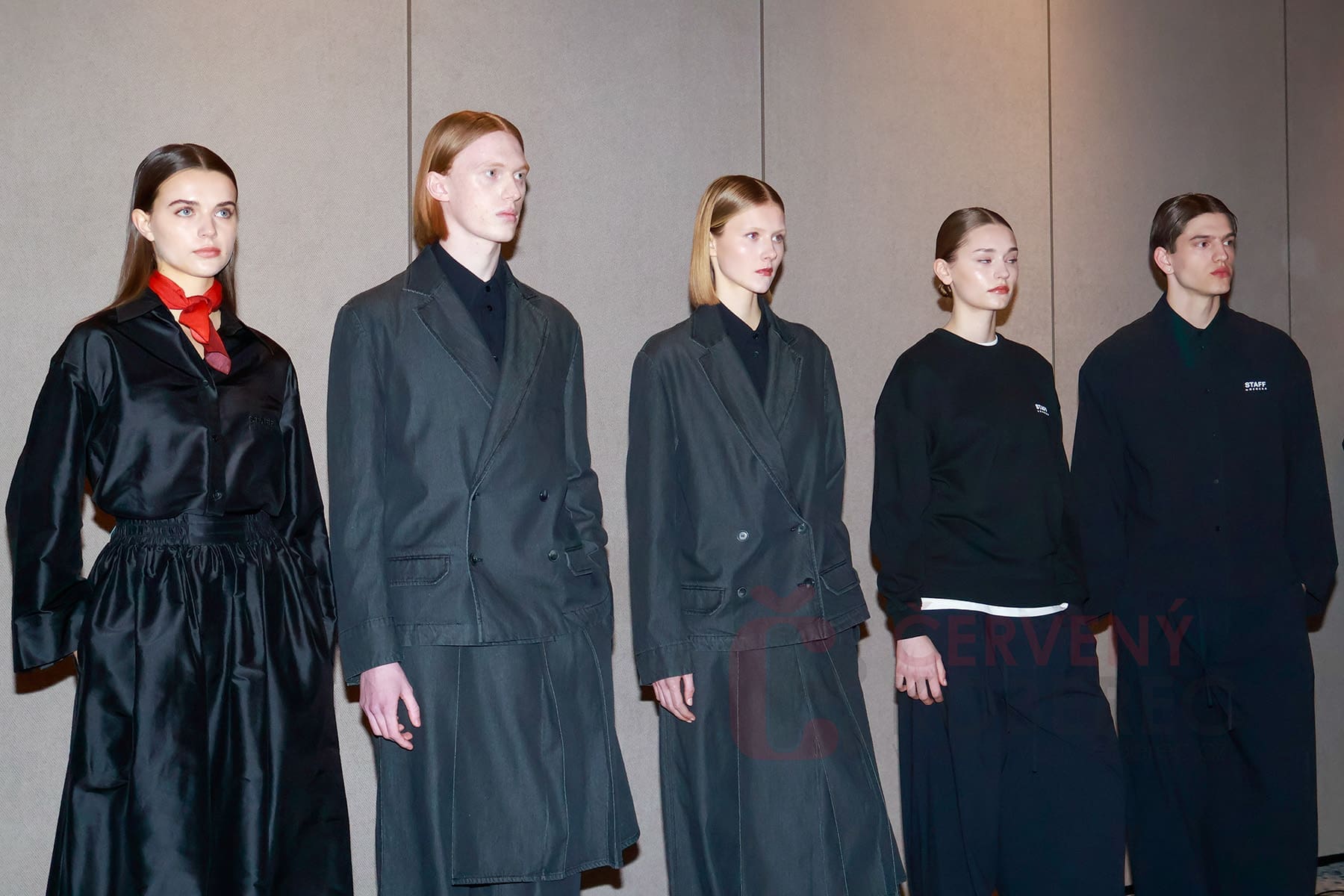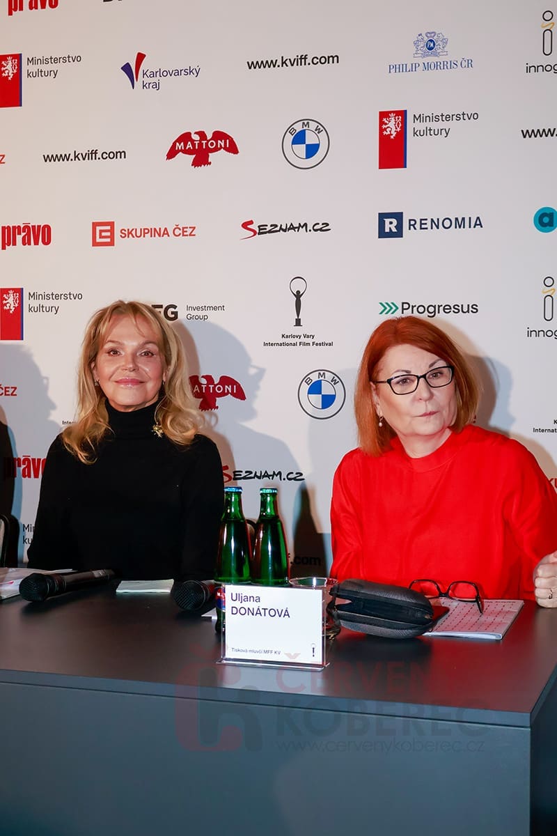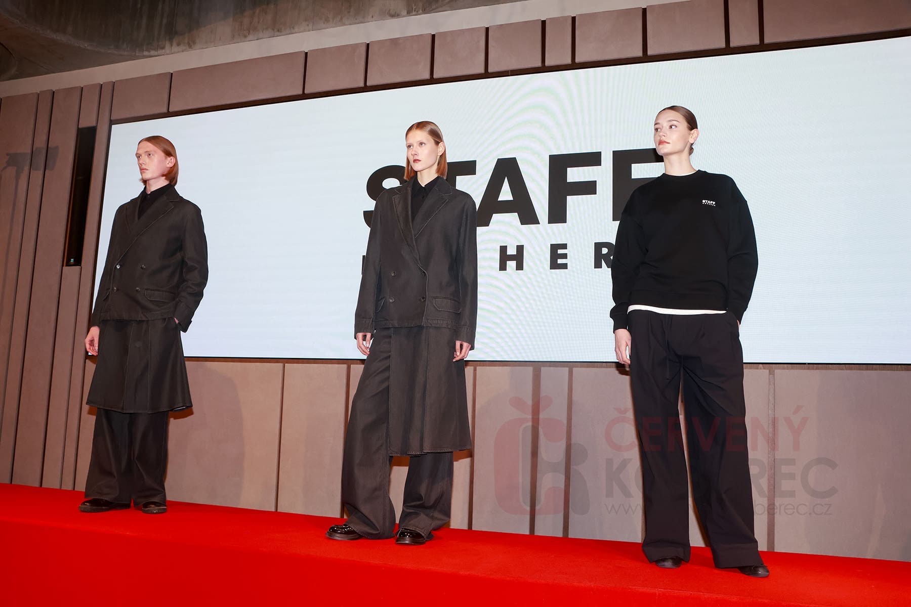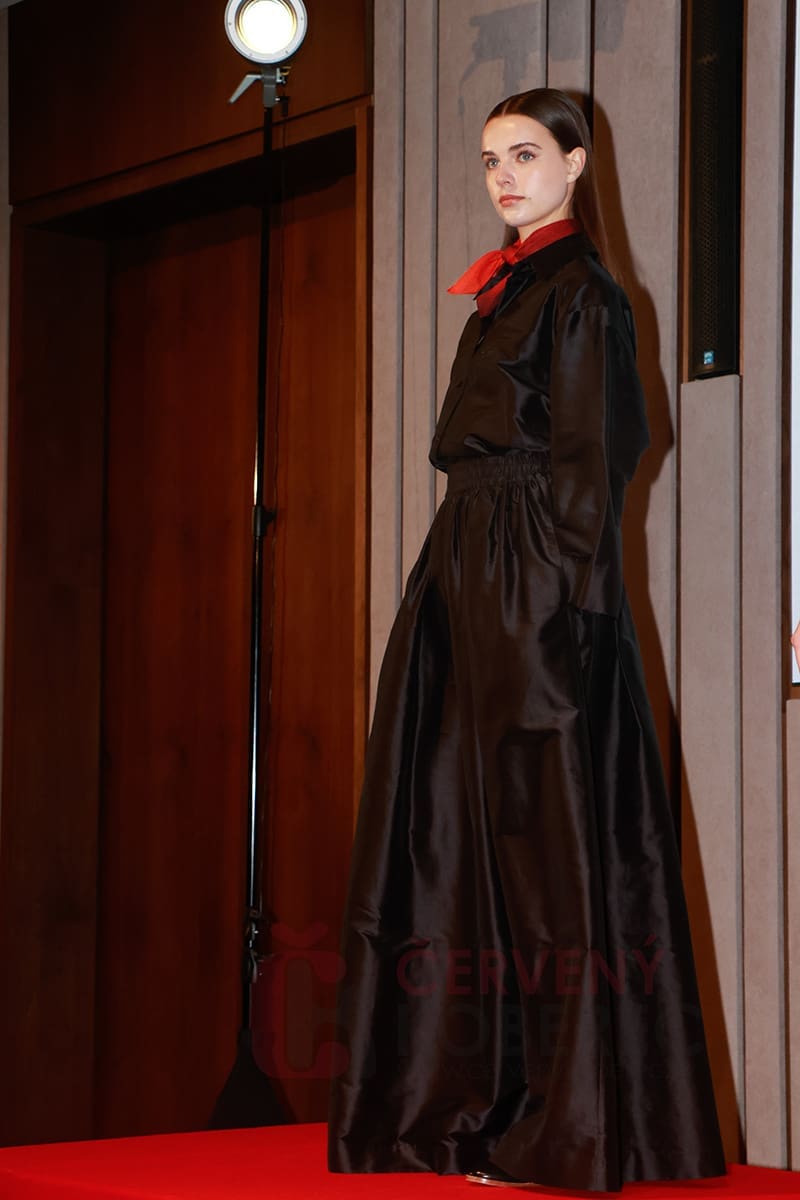 Pro účastníky tiskového setkání byla připravena i menší módní přehlídka, na které byla odprezentována letošní kolekce pro personál karlovarského festivalu, kterou doplňuje i červený detail odkazující na letošní vizuál, a to červený koberec.